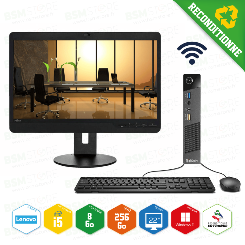Lenovo - PC Complet M73 Tiny i5-4eme 2,6GHz 8Go 256SSD Win11Pro avec écran 22" + clavier et souris + Wi-Fi - Reconditionné